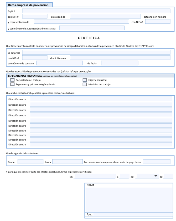 - Acreditar que la empresa dispone de un contrato activo de prevención de riesgos laborales.