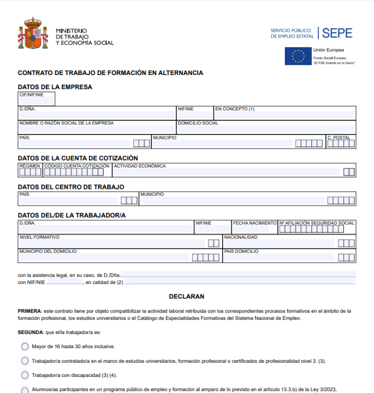 - Descarga y cumplimenta el modelo oficial del contrato de formación en alternancia desde la web del SEPE.