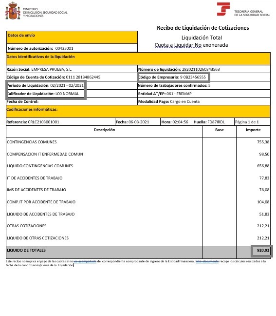 Este documento se genera automáticamente tras la presentación de la liquidación mensual de cuotas (a través del Sistema RED o el servicio online de la TGSS) e indica los importes ingresados por la empresa o autónomo en concepto de cotizaciones de trabajadores, contingencias comunes, profesionales y aportaciones empresariales.